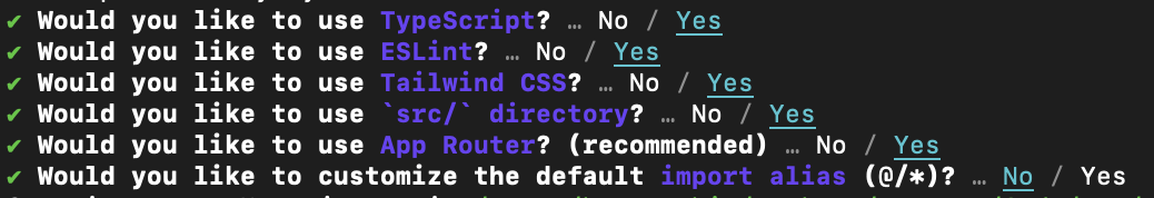 제일 헷갈리는 건 App Router을 쓸 건지 묻는 옵션이었는데, App Router을 추천하길래 그냥 썼다. 여기서 No를 선택하면 자동으로 Pages Router을 사용하게 된다.