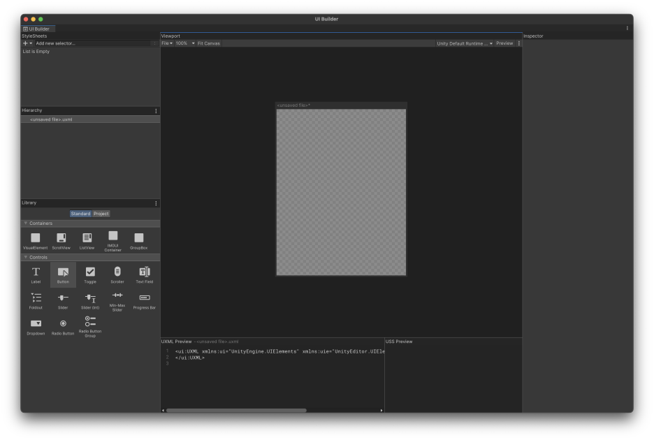 이제 UI Builder 창의 좌측 상단에 있는 StyleSheets 탭의 + 버튼을 눌러 새로운 uss 파일을 생성해주자. 이제 위에서 만든 버튼에 클래스를 적용시키고 uss selector을 이용해서 스타일을 지정해줌으로써 우리가 목표한 버튼 모양을 만들 것이다. uss selector에 대한 자세한 내용은 아래의 unity 공식 매뉴얼을 참고하자. 모를 때 보면 무슨 소리인지 모르겠지만 알고 보면 정말 다 적혀있는 마법의 매뉴얼이다. 이전에 css를 다뤄본 적이 있는 사람이라면 이미 알고 있을 것이다.