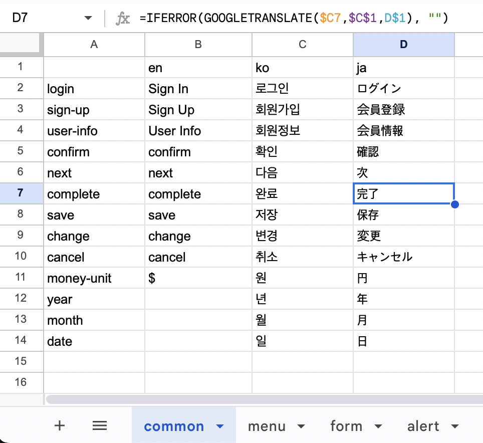 나는 한국어 기준으로 번역을 돌렸고, 번역 텍스트가 없어 에러가 날 경우를 대비하여 IFERROR을 이용해 에러 핸들링을 해주었다. 아래 사진의 수식을 참고하여 작성해보자.
