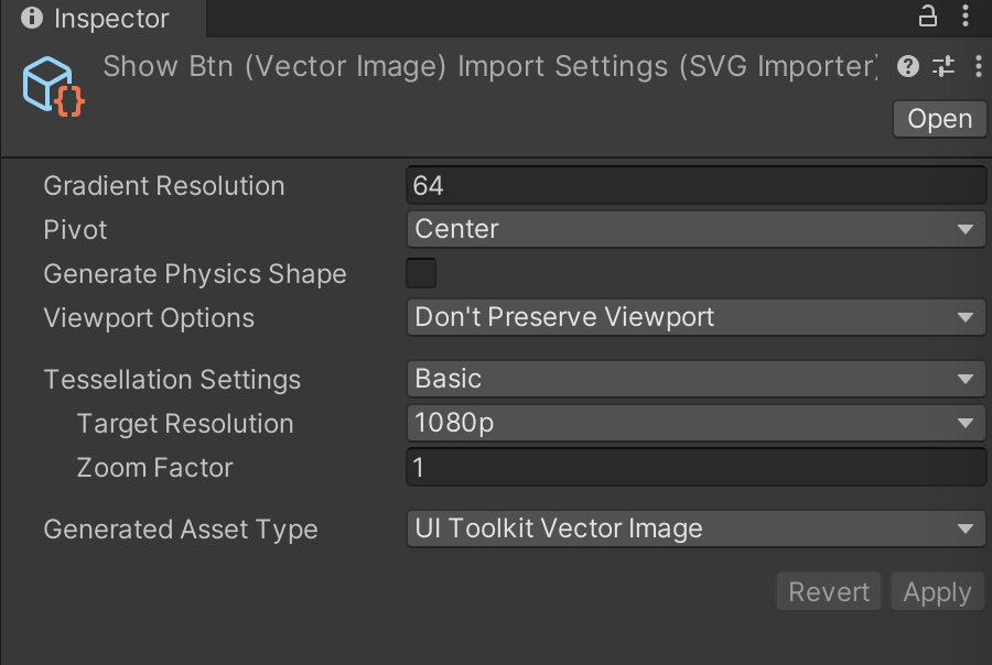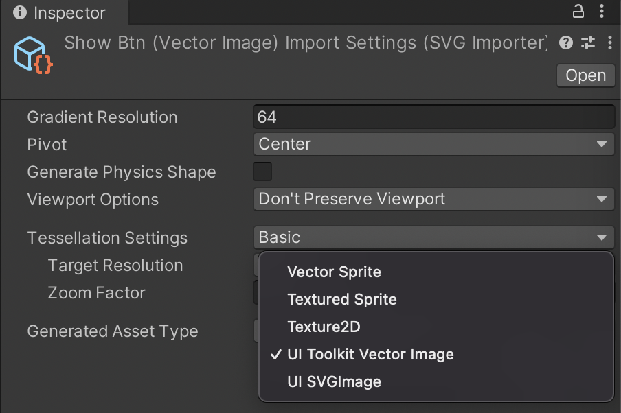 아래의 설정 중 Generated Asset Type을 UI Toolkit Vector Image로 바꾸어 주면 이제 svg 파일을 UI Toolkit에서 벡터 객체로 불러올 수 있다.