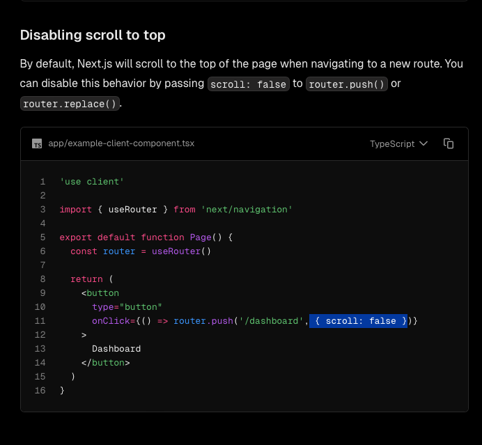 이때 갑자기 머리 속에서 지나간 생각:router.push에 옵션이 있지 않을까?그래서 바로 공식 문서 찾아보니까 나오더라. 럭키... 최고... 너무 간단해... 바로 해결...