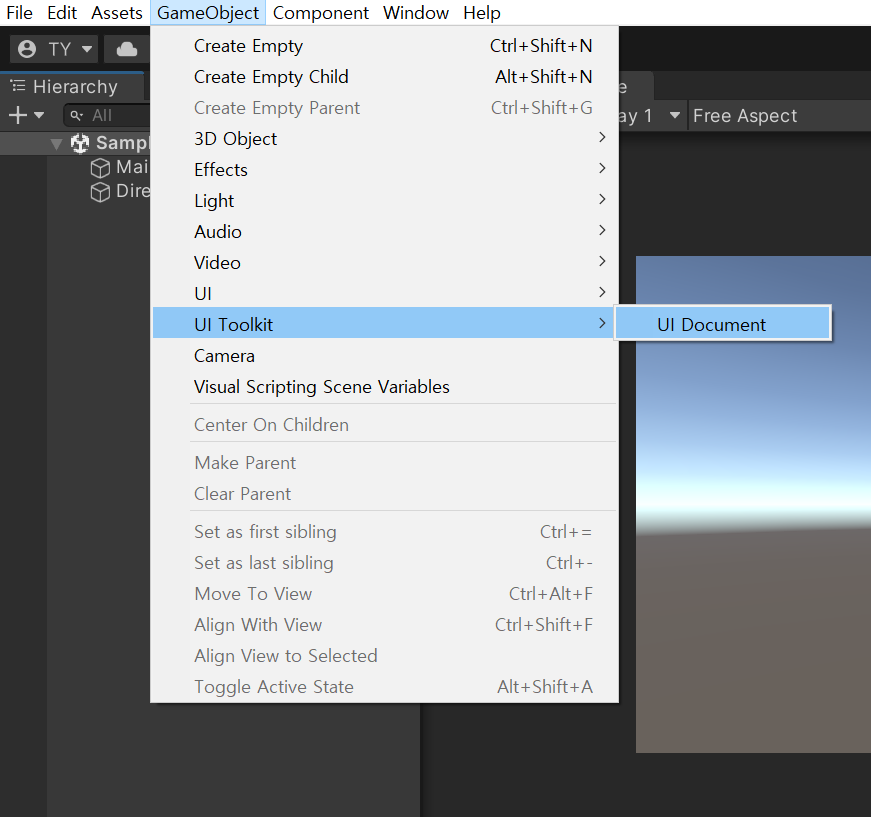 1. GameOject > UI Toolkit > UI Document를 클릭하여 UI Document 객체 생성
