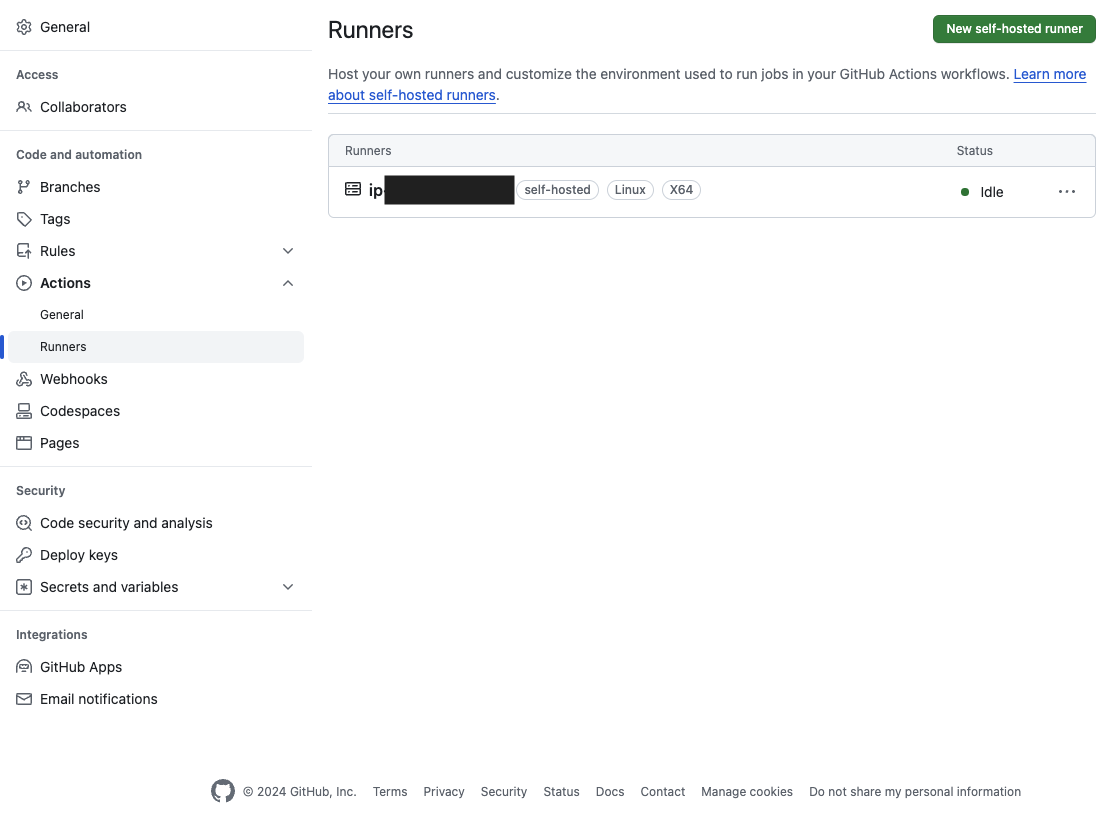 모든 설정이 완료되면 GitHub의 Runners 페이지에서 설정한 Runner가 idle 상태인지 확인한다.