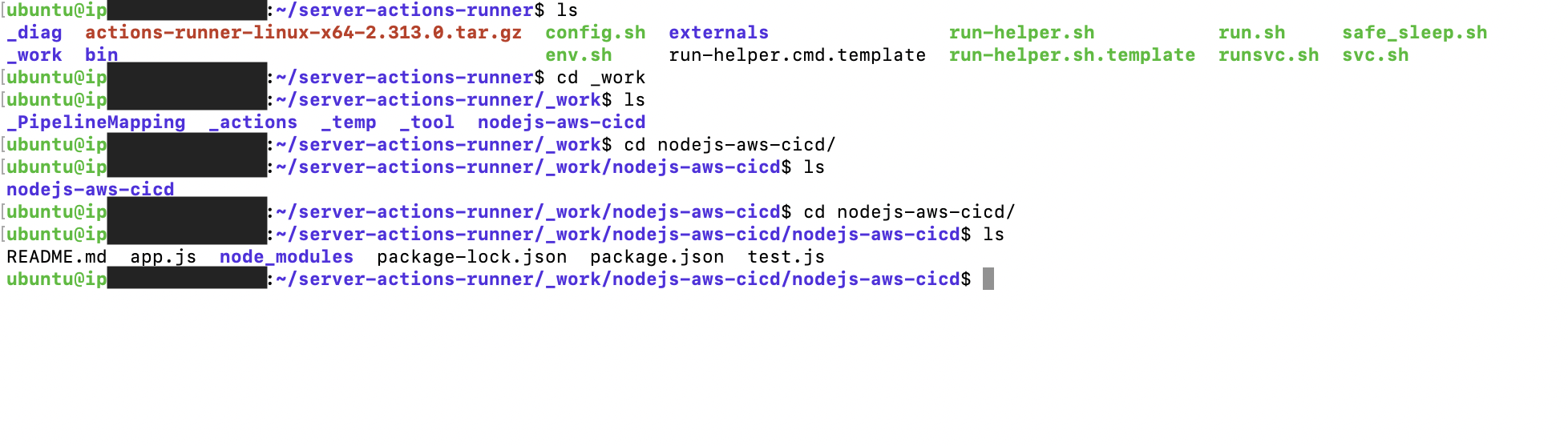 AWS EC2로 접속하여 생성한 GitHub Actions runner 폴더 안에 GitHub의 main 브랜치 파일들이 들어와 있는지를 확인한다. npm ci 명령어 덕분에 node_modules도 자동으로 설치된 것을 확인할 수 있다.