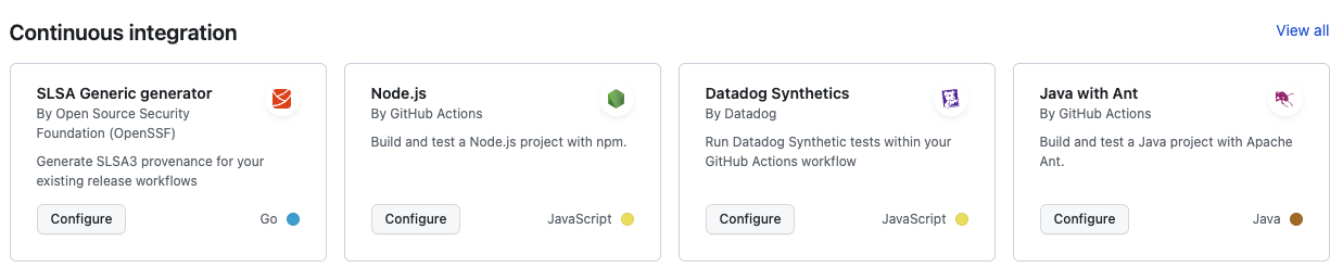 이어지는 화면에 보이는 Workflow 템플릿 중 [Continuous Integration] - [Node.js]의 Configure를 클릭한다.