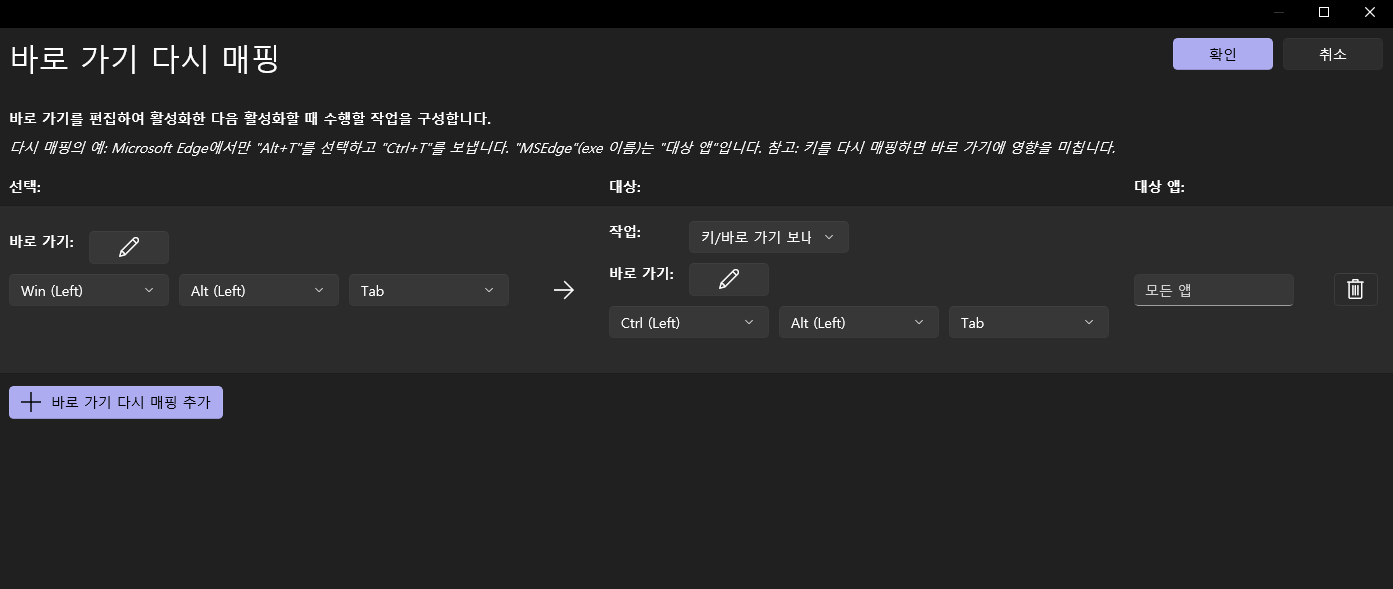 기존의 win + tab과 ctrl + alt + tab이 리매핑된 결과를 입력하면 된다.