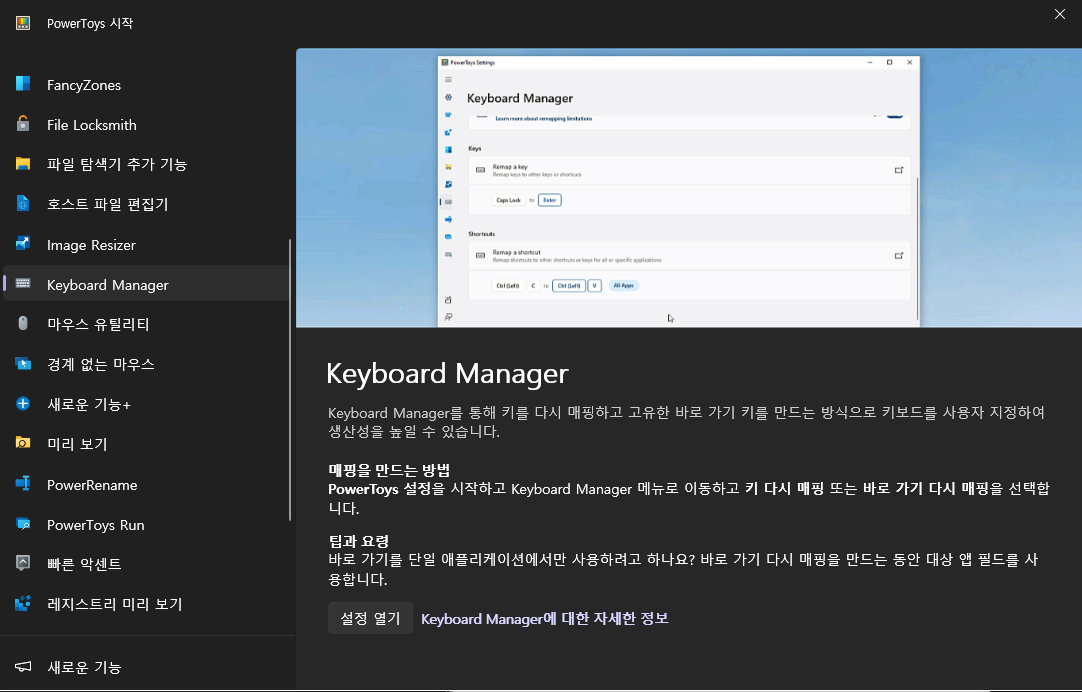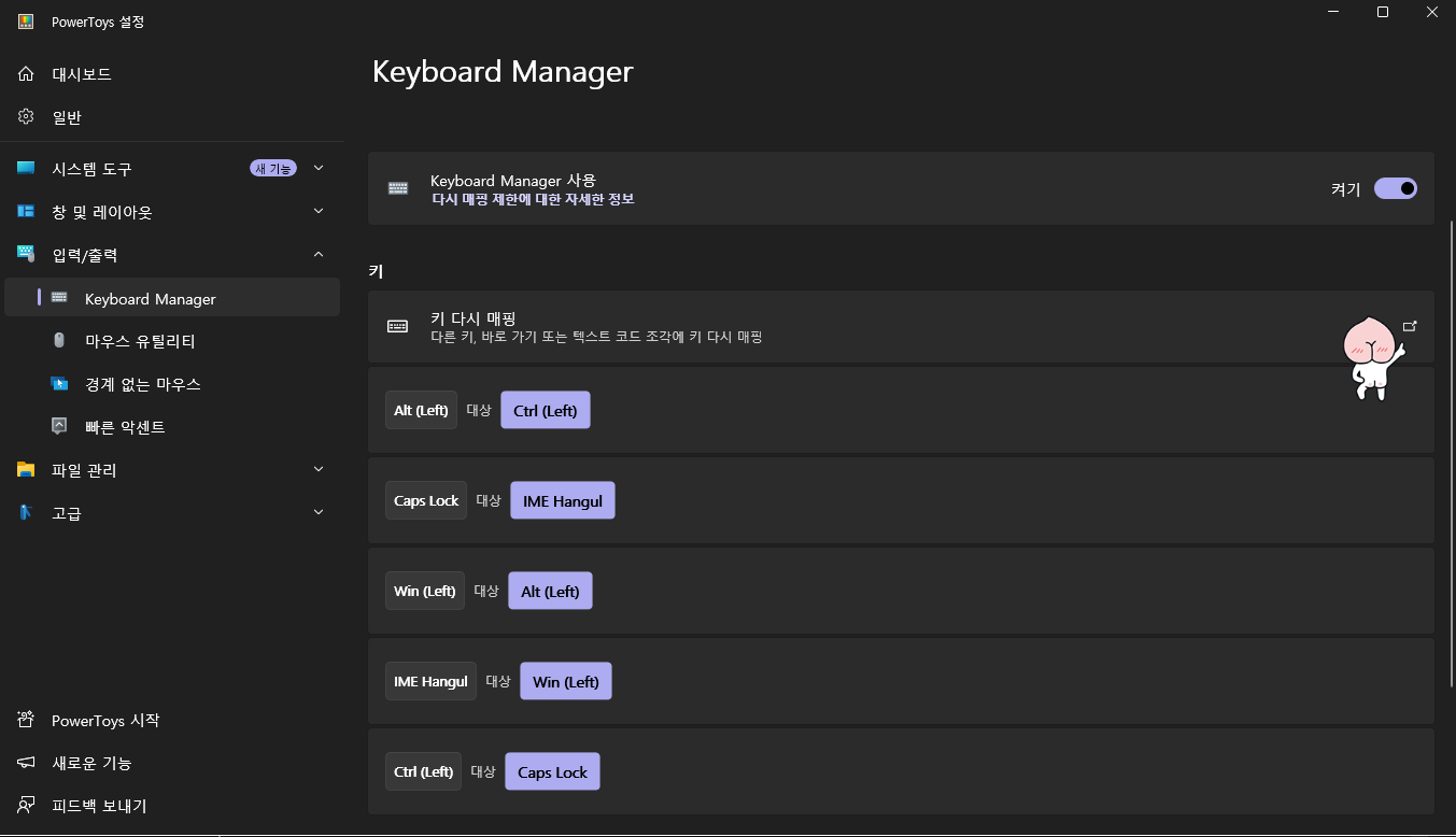 PowerToys의 좌측 탭 메뉴에서 Keyboard Manager을 찾아 클릭한다.