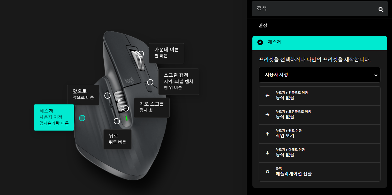 앱을 설치하고 들어가보면 여러 로지텍 기계들을 한번에 관리할 수 있고, 아래 사진과 같이 마우스 버튼을 커스터마이징 할 수 있다.