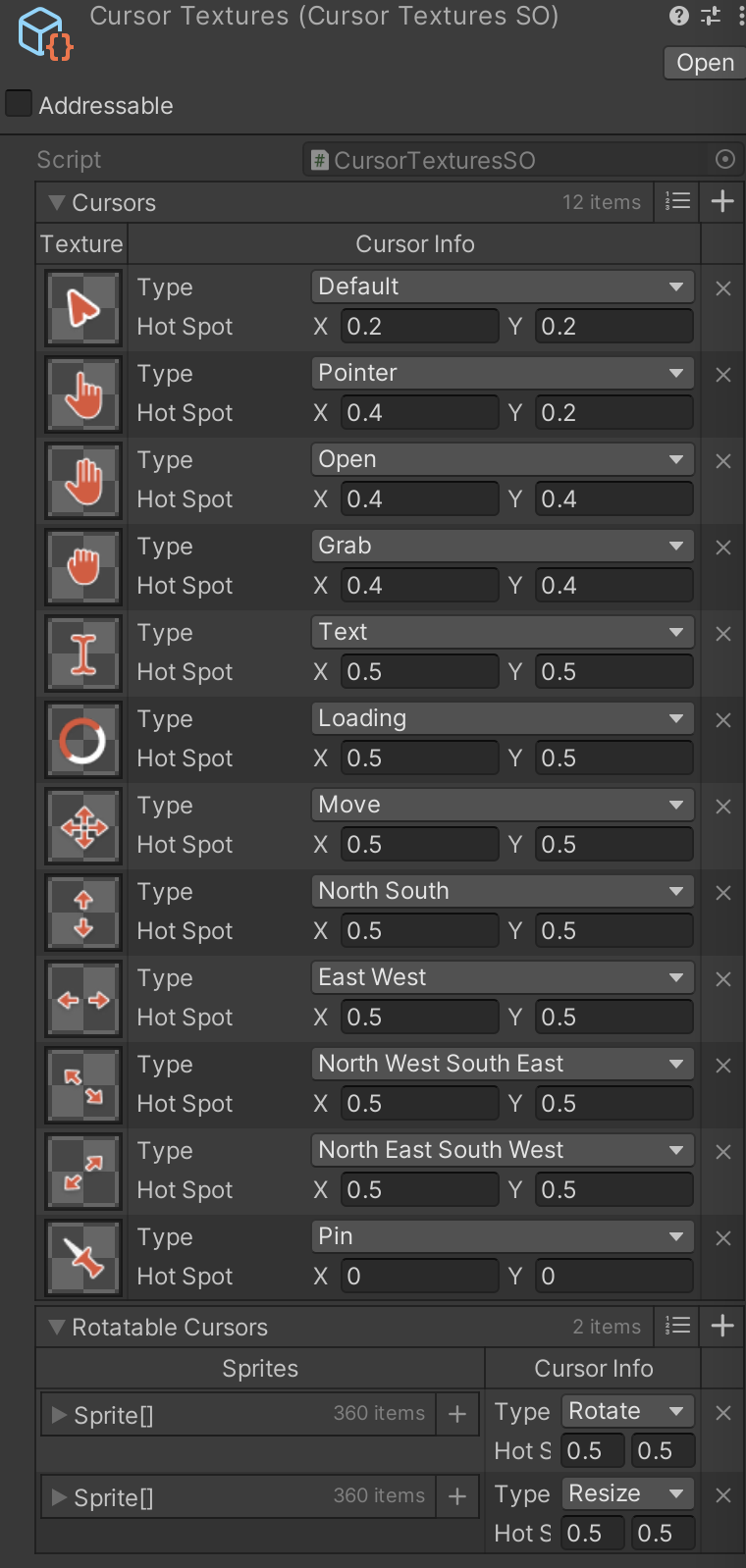 _rotatableCursors.Add(CursorTexturesSO.RotatableCursors[i].Type, CursorTexturesSO.RotatableCursors[i]);