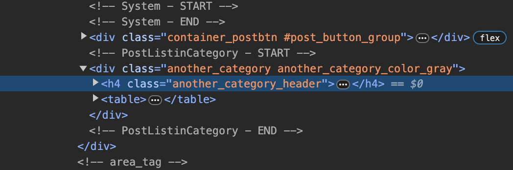 Crome에서 F12를 눌러 devTool을 열어 확인해보면, 아래와 같이 카테고리의 다른 글이 <h4> 태그로 생성되는 것을 알 수 있다.