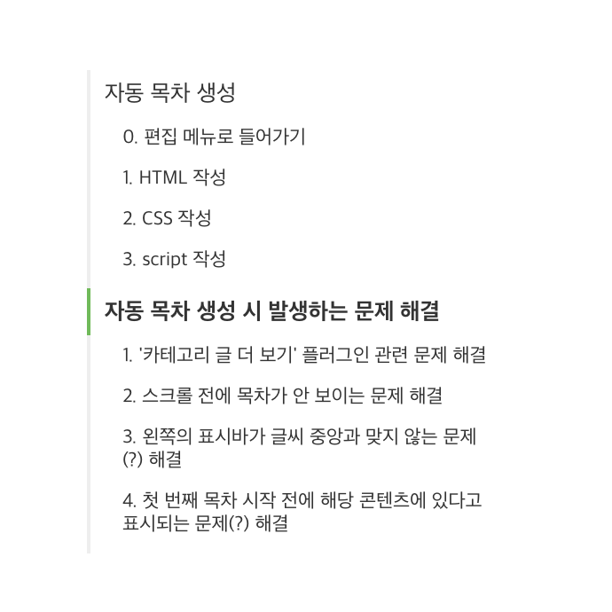 이게 핵심이다. 열심히 찾아보지는 않았지만, 대부분 이 문제를 해결하지 못한 것 같아 목차 생성하는 김에 해결했다.